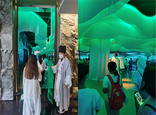 這個(gè)場(chǎng)景中,影像的呈現(xiàn)可謂十分精妙,不同于紛亂的色彩渲染,這樣素凈的展示形式更好地烘托了實(shí)景表演的氛圍,同時(shí)又讓觀眾了解表演的內(nèi)涵。不喧賓奪主卻又將沉浸展一步步推向高潮,在這個(gè)起到“承上啟下”作用的通廊中,影像的表現(xiàn)盡善盡美。