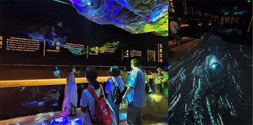 在觀展的最后,我來到了《千里江山圖》長(zhǎng)卷的賞析室,配合墻上對(duì)畫作的解讀再看陳列柜中的真實(shí)畫作,即便是對(duì)藝術(shù)毫無造詣的我也有了一些啟迪。而隱藏于布景之中的視美樂投影機(jī)在這個(gè)空間中則充當(dāng)起了“氣氛組”的功能,為這個(gè)有些枯燥的閱讀時(shí)間營(yíng)造了一個(gè)“溶洞石窟內(nèi)探求絕世妙筆”的沉浸式場(chǎng)景。