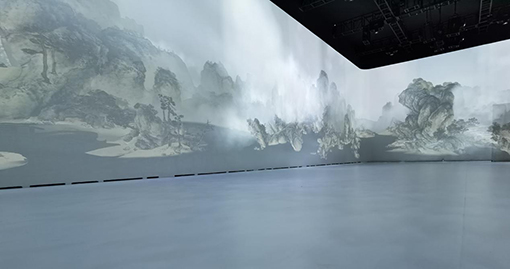 在展覽的末尾設(shè)置有一個長約20米,寬約10米的大型沉浸影像空間,28臺投影機吊頂投射形成了5面內(nèi)容覆蓋的CAVE項目。如果你細心、靜心觀看,這里所展現(xiàn)的光影圖景或多或少有著此前展覽中頗多名畫的韻味,正所謂“文藝大同”在流光匯聚、飛瀑傾斜間處于投影空間中的我們再次鑒賞著科技呈現(xiàn)而出的“傳統(tǒng)”。