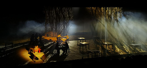 關(guān)于演出的劇情,我并不想劇透,在這場關(guān)于“糧食”的戲劇中,影像的適時出現(xiàn)奠定了每個場景的基調(diào)。更具體說,在那些靠實體布景無法完成或難以實現(xiàn)的戲劇假想場景中,影像擔(dān)當起了重任。如上圖一片代表著希望的麥田在人們絕望的盡頭終浮現(xiàn),伴隨著振奮的音樂,觀眾向四周望去,那種沉浸于戲劇中的壓抑情緒得以釋放,共情至深。