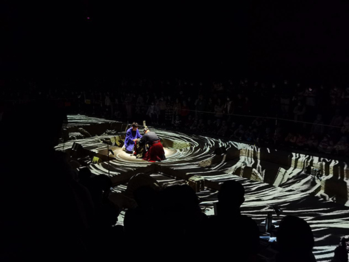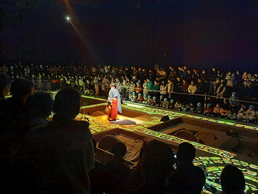 正如前面所說影像的“代入感”,在這個周天子遺址的劇場內(nèi),影像圖案的變換讓靜止不動的場景完美呈現(xiàn)出了一場“穿越”的故事。影像不僅是敘事的工具,同時也是一種情感的傳遞,就如以上三幅圖,影像分別代表了周天子王朝興盛之下的盛況、天子御駕親征卻戰(zhàn)死沙場后國家的破敗荒蕪、古今交匯之際情感交織一起的錯綜紛亂。