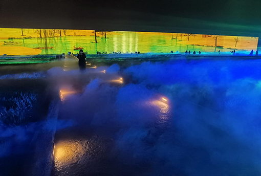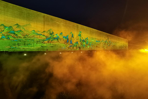水霧彌漫,從喧鬧的市集到壯闊的江山!千里江山長卷的色彩與底蘊為世人稱贊,影像“忠于真實”的還原不僅讓這幅曠世佳作有了壯闊之感,環(huán)繞身旁的霧氣更讓觀眾仿佛飄飄欲仙進入了畫中幻境。