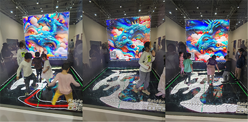 上圖展項(xiàng)是展會(huì)中的孩子們的聚集點(diǎn),當(dāng)空間內(nèi)有人行走,地面的“路徑”便會(huì)逐漸點(diǎn)亮,最終輸出一幅獨(dú)具一格的AI畫作?此破匠5腁I作畫展項(xiàng)從大眾娛樂(lè)的角度來(lái)說(shuō),每次畫作的變化保持了體驗(yàn)的新意與熱情;從思想內(nèi)涵的角度考慮,成年人看到此空間很可能只會(huì)按部就班地循著路徑行走,甚至還對(duì)孩子們的做法無(wú)奈苦笑,最終輸出一幅“有板有眼”的圖像,而孩子們則往往是嬉笑跑鬧,最終輸出的圖像也承載著“天馬行空”的暢想。人們對(duì)創(chuàng)作與生活的熱情是否隨著年齡的增長(zhǎng)消褪淡漠?各種緣由每個(gè)人心中都有答案……
