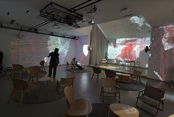 就觀看體驗(yàn)而言,循環(huán)播放的新媒體藝術(shù)作品大概率并非觀眾的喜好,更與所謂的藝術(shù)鑒賞毫無(wú)關(guān)系,但正是這樣一個(gè)略微昏暗、安靜且免費(fèi)的空間,有足夠的“魔力”留住來(lái)此的顧客。人們并不在意身邊放映的影像內(nèi)容是什么,但偶爾看到令人驚艷的一幕還是會(huì)投出贊許的目光,這或許影像的魅力?但我想這更多是源于人們渴望尋求一個(gè)與外界(長(zhǎng)期生活的空間)略有些不同,卻又不出格(非全沉浸式,不脫離現(xiàn)實(shí))的放松休息的空間。