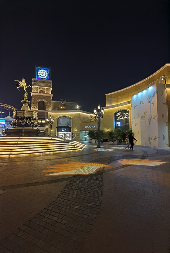 從朝陽(yáng)公園繼續(xù)走進(jìn)藍(lán)色港灣商業(yè)街區(qū),燈光依舊璀璨,但影像則由主導(dǎo)地位退居至氣氛組,在商圈步行街內(nèi)不時(shí)點(diǎn)綴,調(diào)動(dòng)游客興趣。此時(shí)影像的“拍照打卡”能力更多是為存在已久的商業(yè)街區(qū)增添活力,通過(guò)游戲性的拍照互動(dòng)、動(dòng)態(tài)的影像內(nèi)容把人流留在商業(yè)空間內(nèi),以此推動(dòng)商業(yè)綜合體發(fā)展。