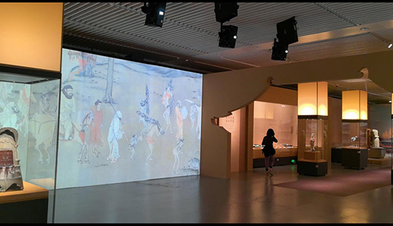 方才剛說到歌舞,這由一臺索諾克投影機呈現(xiàn)的靈動舞者便再次賦予“石刻胡旋舞墓門”文物以生機,由靜轉(zhuǎn)動的形式實現(xiàn)了最為直觀的知識傳遞,也簡單直接的在觀眾腦海中刻錄下“胡旋舞”的記憶。影像的文旅價值正是在于這種“文化能效比”的轉(zhuǎn)換,用時代弄潮的形式傳承淵源文化。