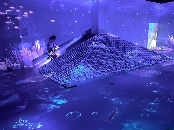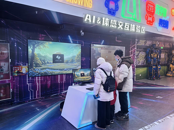 隨著人流進入館內(nèi)大廳,筆者旁聽到場觀眾與工作人員的交談,多數(shù)來此的觀眾都是聽聞此處有適合孩子來玩的互動體驗游戲,還有數(shù)字藝術(shù)展示?梢姅(shù)字AI盛行的時代,人們對娛樂的關(guān)注點與體驗傾向正在發(fā)生變化,由影像手段組建的視覺藝術(shù)項目已經(jīng)成為一種引導(dǎo)大眾消費的標(biāo)志物。