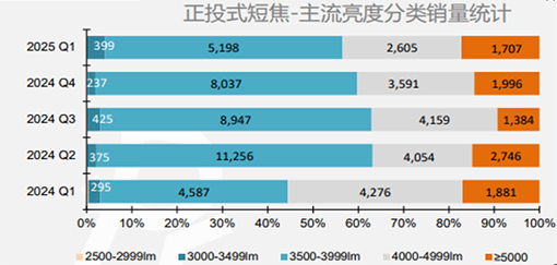 [前景觀察] 數(shù)據(jù)總結(jié)-2025Q1,反射式短焦產(chǎn)品銷量同比下降。激光電視廠商的產(chǎn)品品類變化較大,86英寸以上大尺寸液晶電視持續(xù)價格下跌進而阻擋激光投影電視成長也是主要原因之一。正投短焦產(chǎn)品主流亮度段為3000-3999流明檔。反射短焦產(chǎn)品中,2000-2999流明亮度段同比下滑,3500-3999流明亮度段取代3000-3499流明段趨勢明顯。