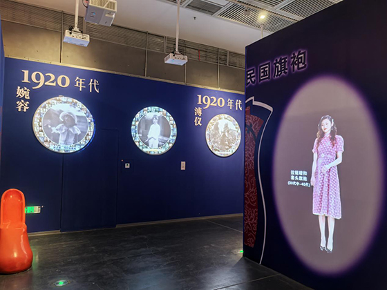 此處還是由奧圖碼投影機(jī)營造的肖像服飾展示,前方的影像更加突出不同服飾的穿著效果,而后方的影像則是選取了婉容、溥儀兩位重量級的“模特”,再現(xiàn)真實歷史中的“皇家服飾”。一處影像同時“詮釋科技、復(fù)現(xiàn)歷史”,作為娛樂,影像顯然更具深度;作為展覽,影像則又頗為生動,一舉兩得,此為光影藝術(shù)之精髓。