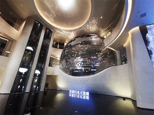 此次贏康參與完成的球幕影院,就位于格調(diào)天湖先導體驗區(qū)的世界云旅中心一層,整個球幕影院球體貫穿三層樓的空間,凸出的球體造型外部以銀色鱗片覆蓋,不同角度的鱗片將室內(nèi)的燈光折射出光影斑駁的效果,讓整個空間更加靈動,科技感十足,十分吸引人眼球。
