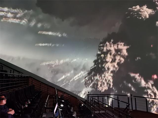 中心內(nèi)部是一個直徑為20米的沉浸式異形球幕,贏康采用了數(shù)十臺10,000流明4K投影機(jī),針對全景球幕、地面和觀眾座椅斜坡進(jìn)行投影,通過精心的設(shè)計,讓空間內(nèi)的每個角落都完美覆蓋投影畫面,使整個空間渾然一體,打造出身臨其境的極致沉浸感。