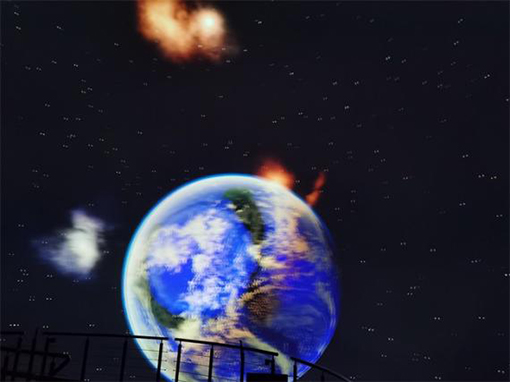 Infinity媒體服務(wù)器處理球幕投影的變形與融合,輸出立體同步信號;并通過Scalable加7thSense變形融合,實現(xiàn)球幕、地面、斜坡的投影變形融合的自動校正,最終生成立體畫面,解決了720°穹幕立體仿真圖像融合的難題。