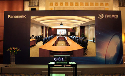 該展項由兩臺松下液晶工程投影機PT-SLZ66C正投融合于幕布之上,結(jié)合可提供完整的會議室寬屏幕顯示投影解決方案的BAVG處理器,輔以及AW系列攝像機和HDCOM