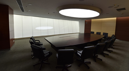 落地玻璃窗使用了調(diào)光玻璃技術(shù),當(dāng)未通電時(shí),玻璃窗呈透明狀態(tài),辦公區(qū)全景清晰可見;當(dāng)接通電源時(shí),玻璃窗呈不透明狀態(tài),滿足了投影成像的需求。兩種狀態(tài)可以自由切換,簡單方便。這套投影系統(tǒng)采用4臺(tái)PT-FRZ68C激光投影機(jī)通過吊裝背投融合,將原本靜態(tài)的玻璃窗變成一副動(dòng)態(tài)的立體影像,在節(jié)省了空間的同時(shí),帶來了絢麗多彩的視覺體驗(yàn)。創(chuàng)意十足的投影系統(tǒng)為傳統(tǒng)會(huì)議室增添了許多科技元素。