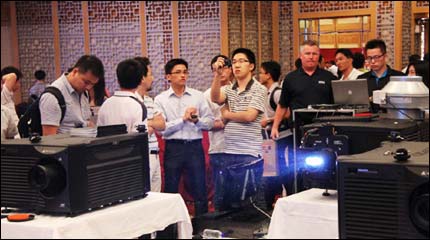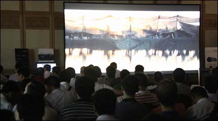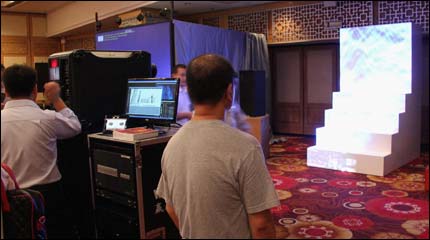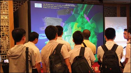 贏康立體仿真整體解決方案展區(qū)人頭攢動(dòng),此次展出的仿真整體解決方案是工業(yè)設(shè)計(jì)方面的內(nèi)容,完全是由贏康自主制作,并首次采用了攝像跟蹤定位系統(tǒng)。觀眾戴上六點(diǎn)定位眼鏡,手持遙控手柄,就可以非常直觀地互動(dòng)控制3D影像,比如拉近,放大,縮小,翻轉(zhuǎn),甚至虛擬“拆卸、裝配”等等,專業(yè)性和趣味性大大提升。據(jù)了解,該系統(tǒng)采用了科視Mirage投影機(jī)和dnp新一代背投屏幕Zenith,并集成其他頂級(jí)跟蹤設(shè)備和軟件,可非常專業(yè)地實(shí)現(xiàn)虛擬樣機(jī)展示和互動(dòng),在工業(yè)設(shè)計(jì),軍事仿真,醫(yī)療研究有極大的應(yīng)用價(jià)值,吸引了專業(yè)客戶、設(shè)計(jì)研究人員和業(yè)界人士的目光。