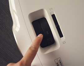 用時(shí)通風(fēng)效果良好;機(jī)身兩側(cè)比較簡(jiǎn)潔;機(jī)身頂部設(shè)計(jì)有燈泡更換區(qū)域,擰下一顆螺絲釘便可輕松更換燈泡;同時(shí)頂部擁有變焦與聚焦旋鈕,兩個(gè)旋鈕阻尼感適中,調(diào)解時(shí)靈敏舒適;頂部后方