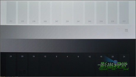 這張測試組合圖樣用來檢查投影畫面難以再現(xiàn)的極端灰度值,灰度范圍包含0—255。頂部灰度色條對(duì)于檢查白色飽和度和接近白色區(qū)域的色彩很有用,每個(gè)色塊之間的差值為白色的0.75%,范圍是94%-99%;底部的深色灰度對(duì)于檢查黑度和近黑色再現(xiàn)很有用,每個(gè)色塊之間的間隔為白色的1.5%,范圍是峰值白色的1.5%-12.5%。投影體驗(yàn)時(shí)我們需要注意觀看每個(gè)色塊之間的變化。