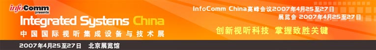 | 2007年中國國際視聽集成設備與技術展 (IS China) 從2007年4月25日至27日舉辦三天。展會邁進第五個年頭,今年共有194家來自17個國家總的海外和國內(nèi)參展商, 較2006年展會規(guī)模擴大了33%,展會展出面積達13,600平方米。大約有超過一萬名業(yè)內(nèi)專業(yè)人士和從業(yè)者前來參觀這個迄今規(guī)模最大的IS China展會,這些參觀者包括系統(tǒng)集成商、設備安裝人員、視聽設計顧問、零售商、分銷商、租賃及演出承辦商、編程人員和制造商。 |