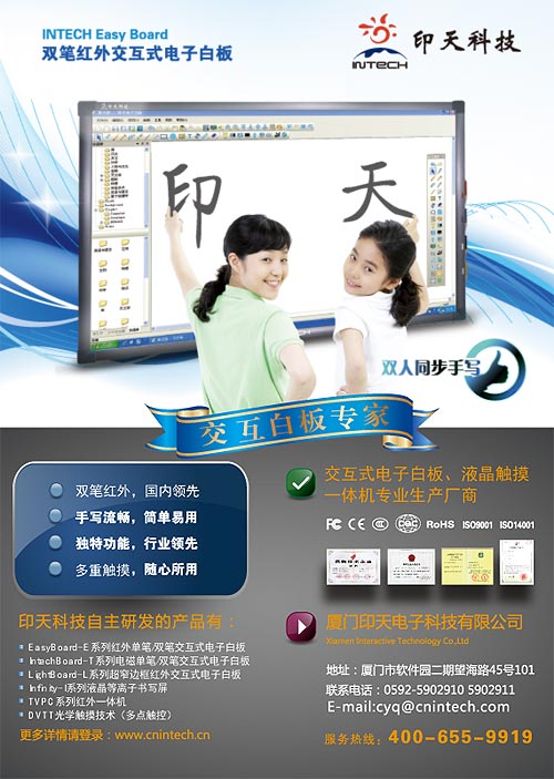 終于,印天科技于2011年7月正式對外宣布,由印天科技自主研發(fā)、設(shè)計(jì)并生產(chǎn)的紅外雙筆交互式電子白板Easy