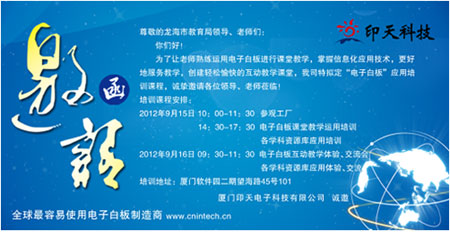 9月15-16日,受我司邀請,龍海市二十多位教育局領(lǐng)導(dǎo)、老師蒞臨我司參加電子白板培訓(xùn)會,他們對此次培訓(xùn)充滿了好奇,興趣十足,在印天銷售總監(jiān)陳先生的陪同下,一起走進印天公司,開始電子白板教學培訓(xùn)之旅。