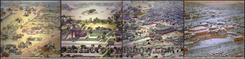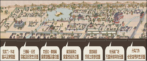 《大明宮全景圖》在表現(xiàn)力方面最為奪目的是加入了四季的變幻,春季的桃紅柳綠,夏季的綠意盎然,秋季的秋色繽紛,冬季的白雪皚皚,視覺沖擊力極強。