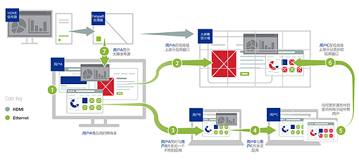 首先,Quant可推送應(yīng)用程序窗口(可設(shè)置不同權(quán)限)至其他Quant用戶或大屏,接受推送的Quant用戶電腦無需安裝對應(yīng)應(yīng)用程序,如Photoshop、SCADA、GIS等。其次,Quant用戶可對同一應(yīng)用程序窗口進(jìn)行共享交互。