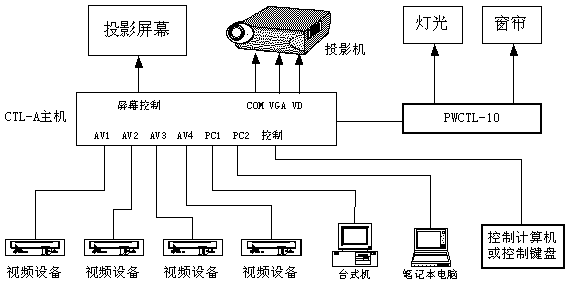 利用CTL-A控制主機(jī)為核心,加配一個(gè)PWCTL-10繼電器模塊,構(gòu)成的多媒體教室(會(huì)議室)集中控制系統(tǒng)見圖。
