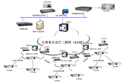 該系統(tǒng)在江西省公安廳網(wǎng)絡(luò)傳輸中心設(shè)置MCU一套,專線接入至省廳SDH傳輸網(wǎng),同時提供以太網(wǎng)電接口,接入到省廳公安IP網(wǎng),實(shí)現(xiàn)E1/IP雙網(wǎng)備份,任何一張網(wǎng)故障,均可實(shí)現(xiàn)自動倒換至另一張可用網(wǎng)絡(luò)。在江西省公安廳網(wǎng)絡(luò)傳輸中心配置迪威視訊的SIAP綜合圖像整合調(diào)度平臺系統(tǒng)。通過SIAP平臺系統(tǒng)通過對矩陣邊界協(xié)議控制網(wǎng)關(guān)能夠?qū)崿F(xiàn)省廳到地市或省廳到縣任意兩級圖像任意圖像資源的調(diào)用,使系統(tǒng)使用、管理調(diào)度扁平化,為應(yīng)急指揮調(diào)度提供很大的靈活性。