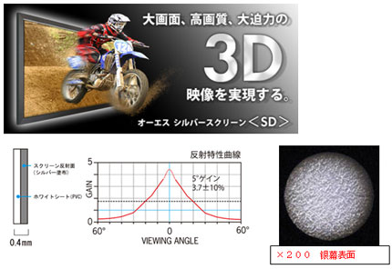 近日、OSSCREEN新開發(fā)了3D專用優(yōu)質(zhì)銀色布料(SD201)。這款新的銀色布料的影像失真率=0.4%,這一數(shù)值達(dá)到了前所未有的水平。另外、此布料如果戴上眼鏡也不會(huì)降低亮度、增益能達(dá)到3.6度。(另外、因?yàn)槭褂锚?dú)特的背面涂層技術(shù),即使再高增益的情況下也不會(huì)讓人感覺到太刺眼)※所謂的影像失真是在播放右眼映像時(shí)所投射出左眼映像的映射率。