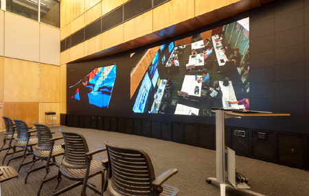 該項(xiàng)目是斯坦福大學(xué)內(nèi)的瓦倫堡廳。瓦倫堡大廳擁有資源豐富的學(xué)習(xí)空間可以實(shí)施靈活的互動(dòng)和實(shí)驗(yàn)性教學(xué)設(shè)施。瓦倫堡大廳作為斯坦福大學(xué)前沿教學(xué)技術(shù)的一部分,設(shè)計(jì)配備了顯示墻技術(shù),該技術(shù)借鑒了美國(guó)宇航局及其他公共機(jī)構(gòu)的指揮控制中心,可實(shí)時(shí)更新信息、收集情報(bào)。該教室配備了32X8英尺的高分辨率顯示屏,由Jupiter