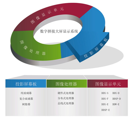屏幕包括純玻璃幕、復(fù)合玻璃幕、樹(shù)脂幕;投影單元分辨率不但擁有1024×768、1400×1050,在2011年率先推出了1920×1080的16:9投影單元,更加符合信號(hào)發(fā)展趨勢(shì),符合人體工程學(xué),具有更高觀看舒適度;反射式、前維護(hù)式、直投式投影箱體供用戶選擇,方便用戶更加貼近實(shí)用的選擇;同時(shí),針對(duì)大屏幕拼接顯示系統(tǒng)的核心——圖像處理器,經(jīng)過(guò)GQY研發(fā)人員的不斷創(chuàng)新,目前已擁有硬件式、分布式、總線式等全系列處理器,將滿足不同用戶不同場(chǎng)合的應(yīng)用。