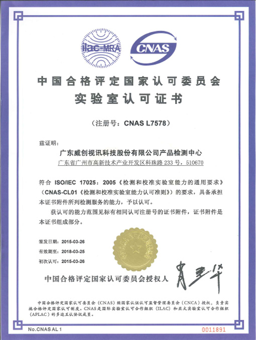 2015年初,威創(chuàng)又成功獲批為2014年度(第21批)“國家認定企業(yè)技術中心”稱號,成為廣州市惟一一家入選企業(yè),在廣東省內也僅四家企業(yè)獲批。此外,這一年,威創(chuàng)產(chǎn)品檢測中心榮獲中國合格評定國家認可委員會(CNAS)實驗室認可證書。