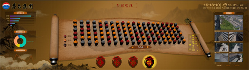 在“數(shù)智茅臺”可視化管理系統(tǒng)展區(qū),威創(chuàng)為其建設的可視化管理系統(tǒng)采用全新3D實時渲染引擎技術(shù),它融入了中國風的水墨畫、飲酒詩人、卷軸等傳統(tǒng)藝術(shù)元素,將茅臺集團復雜的信息數(shù)據(jù)以3D可視化的方式呈現(xiàn),主要包括“集團管控”、“數(shù)說茅臺”、“數(shù)字車間”三大可視化版塊。