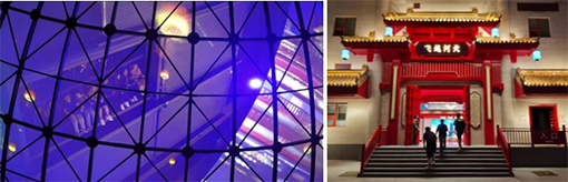 飛越河北5D球幕影院的球幕直徑達(dá)16米(左);飛越河北項(xiàng)目體驗(yàn)入口(右)