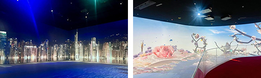 廣東美術(shù)館(左)和廣東文學(xué)館(右)通過(guò)全景曲面屏幕上的沉浸式投影,展現(xiàn)了豐富的文化遺產(chǎn)