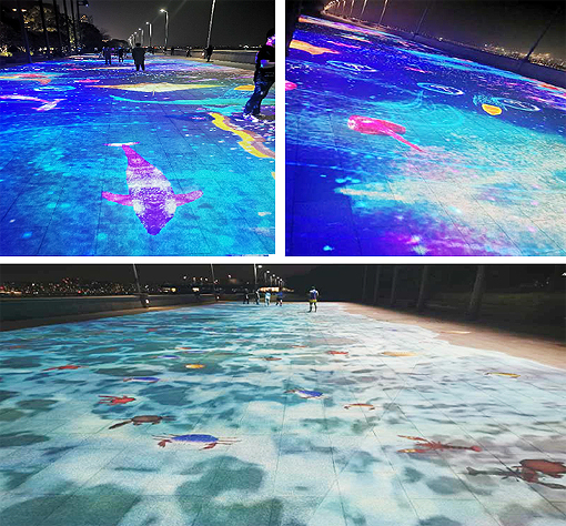 本次錢江新城錢塘江岸投影項(xiàng)目完美展現(xiàn)了地面、沙灘、大海、雷達(dá)的互動(dòng)效果,展示尺寸達(dá)到長100米、寬12米,為杭州市錢江新城景觀亮化工程中,科技與藝術(shù)、人文與生態(tài),注入了新的詮釋,也為杭州市民的夜生活增添了必游之地。