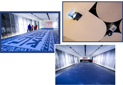最值得一提的是另一側(cè)的展示長廊,由8臺6,000流明*1*2的愛普生激光工程投影機(jī)CB-L1060UNL投影機(jī),搭配4個ELPLX01超短焦鏡頭和4個ELPLW05鏡頭,時尚且富有靈氣的幾何造型,空間感十足的設(shè)計風(fēng)格結(jié)合投影互動效果,讓整個展廳充滿了科技感和未來感。