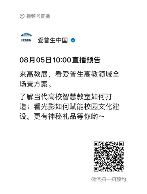 同時愛普生中國視頻號將于8月5日10點進行線上高教展現場直播,歡迎預約觀看!