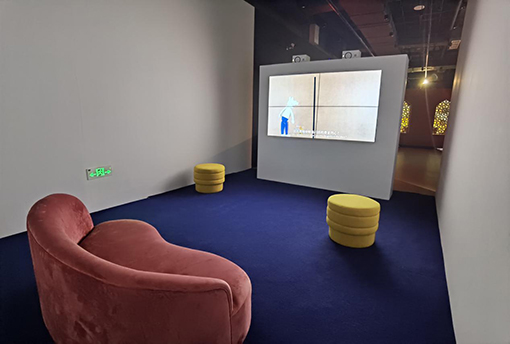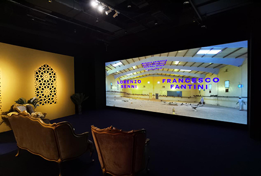隔過一堵墻,一個充滿異域風情的空間中擺放著奢華的座椅,甚至還有一只“金錢豹寵物”趴臥在座位上悠閑地看著紀錄片。單臺高亮清晰的投影機便為這里打造了長逾6米、高約3米的巨幅畫面,講述著技術先進的資本主義世界中,卡塔爾居民在極盡奢華的現(xiàn)代化生活中卻依舊秉持著傳統(tǒng)的獵鷹比賽。傳統(tǒng)文化作為一種“愛”的符號在這里經(jīng)歷著歲月的變遷,在當?shù)厝藗兊男闹惺冀K是“自我”的一部分。