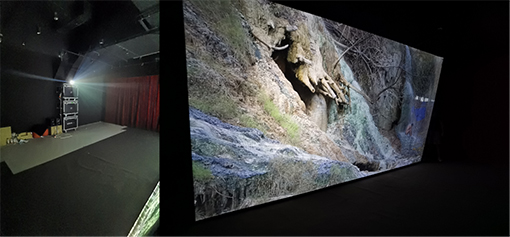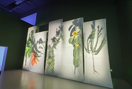 走出前門略帶壓抑情緒的空間,前方的視界豁然開朗。4臺PU系列投影機豎直嵌放于墻壁之中,在如紙一般飄逸靈動的幕布上投影出了幾近逼真的花卉,不加粉飾,素凈的物體與影子相結(jié)合讓其更具真實感。它們迎風飄蕩,彰顯著來自自然的野性氣息,然而在這背后的卻是來自人類鑄造的植物園的束縛。不知從何時開始,人們對“自然”的愛已變得自私,“自然”也近乎失去了本來的面貌……
