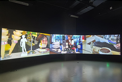 行至此處,本就不同尋常的展覽再次令我震驚,我居然來到了一個審訊室……透過玻璃窗,投影機播放的畫面正講述著一個關于“食物”的訊問過程。在這個故事的世界觀中,世界由無數(shù)餐廳集聚的摩天大樓和遠方的叢林組成,不同物種的廚師在此創(chuàng)造獨特的美食。城市內(nèi),顧客被店主訊問當日的菜品與用餐細節(jié),與此同時,叢林中卻在錄制一個蒼蠅、公雞、青蛙等不同物種嘉賓共同參與的食品主題廣播節(jié)目。