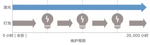 上述時間為非承諾保修時間。激光光源亮度將隨使用時間的增加而逐漸降低。激光光源實(shí)際使用壽命受使用模式、環(huán)境條件、用戶使用習(xí)慣等因素影響會有很大差別。投影機(jī)在低亮度模式下使用,激光光源使用壽命會得到有效延長。