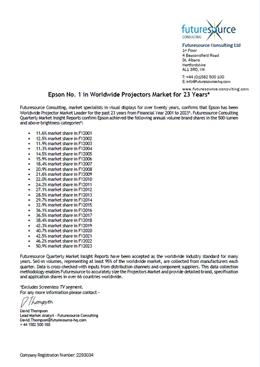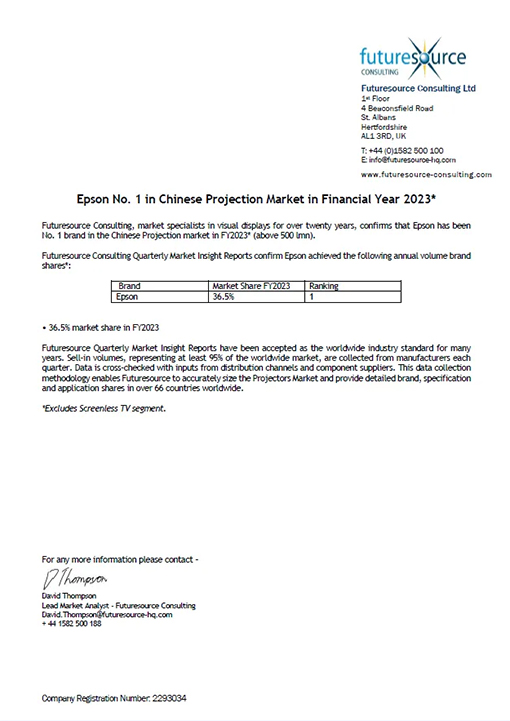 日前,權威市場研究機構Futuresource發(fā)布最新季度市場洞察報告,愛普生再次成為全球及中國市場的焦點--連續(xù)23年蟬聯(lián)全球投影機市場份額榜首*。