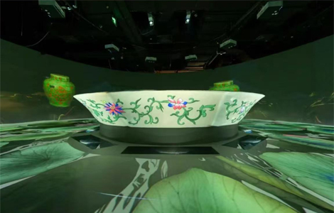 將故宮院藏精品文物,以全方位沉浸式、無縫拼接及異形投影顯示,給觀眾塑造出強(qiáng)大視覺沖擊及高度真實(shí)感、立體感的互動(dòng)三維空間。在此空間的中間還立有一個(gè)巨大的圓盤形裝置,觀眾可以在圓盤周圍的4個(gè)互動(dòng)點(diǎn)位處揮手,點(diǎn)擊墻面紋樣指示進(jìn)行互動(dòng)體驗(yàn)。