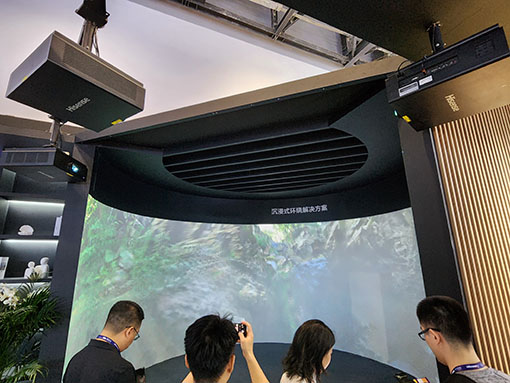 觀眾通過三臺P100系列投影機(jī)形成的環(huán)幕影像,沉浸在“沉浸式環(huán)繞解決方案”中。