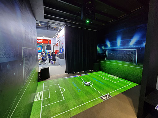 P100系列工程投影機(jī)向地面投射足球場地影像,結(jié)合互動模塊的“XR足球互動”讓觀眾體驗了踢足球的快樂。