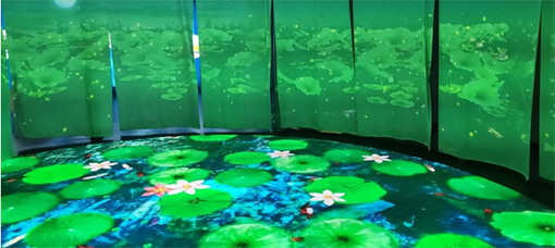 互動展區(qū),麥克賽爾DLP激光工程投影機再次展現(xiàn)了投影魅力,呈現(xiàn)了一場沉浸式互動體驗光影展。環(huán)形排列的感應(yīng)玻璃,顯示出波瀾不驚的水面,觀眾用手將其連接,江湖瞬時連通,水中魚兒暢游、水母綻放。