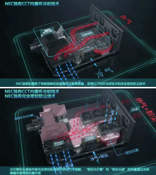 CCT內(nèi)循環(huán)防塵散熱技術(shù)可謂NEC行走江湖的獨門秘籍,它應用于全線激光放映機,在全密封的同時有效散熱,大大延長了整機壽命,保證亮度與色彩的持久穩(wěn)定。