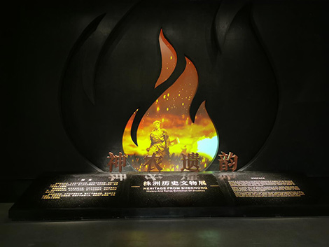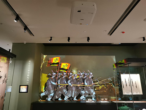 移步歷史文物展廳,PX803UL-BK+以異形雕塑投影的方式,在火焰雕塑上勾勒出株洲的前世今生;PA803UL+以實(shí)物光雕投影的方式,再現(xiàn)2000多年前楚國軍卒手持吳戈征戰(zhàn)、護(hù)衛(wèi)邊疆的戰(zhàn)爭情景。 |