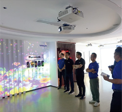 展廳共設(shè)有企業(yè)文化空間、L幕沉浸空間、CAVE沉浸空間、投影藝術(shù)空間以及家庭娛樂空間五大主題應(yīng)用空間解決方案,分別采用Panasonic松下激光長焦投影機(jī)、激光超短焦投影機(jī)、激光短焦投影機(jī)通過七個展項(xiàng)實(shí)現(xiàn)各主題空間的展示效果,并搭配松下獨(dú)有的設(shè)備管理控制系統(tǒng)--“云控智聯(lián)”視頻顯示設(shè)備監(jiān)控軟件,通過一臺安卓平板即可云端實(shí)時控制所有展項(xiàng)。